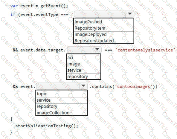 How should you complete the Azure Event Grid subscription? To answer, drag the appropriate JSON segments to the correct locations. Each JSON segment may be used once, more than once, or not at all. You may need to drag the split bar between panes to view content.