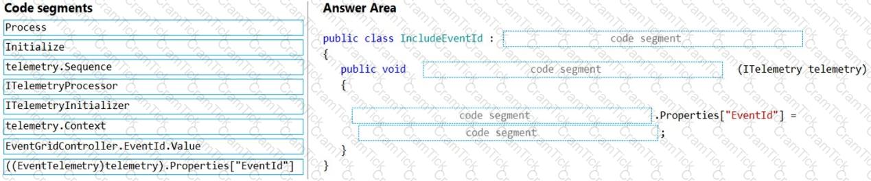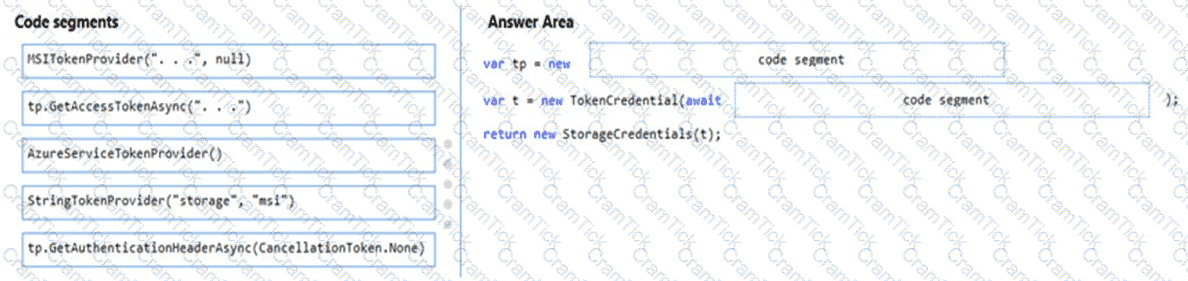 How should you complete the code segment? To answer, drag the appropriate code segments to the correct locations. Each code segment may be used once, more than once, or not at all. You may need to drag the split bar between panes or scroll to view content.