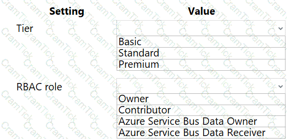 Which Azure Service Bus settings should you use? To answer, select the appropriate options in the answer area.