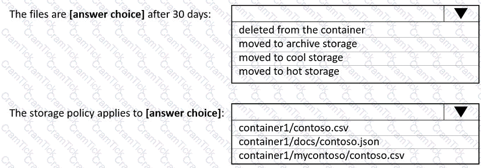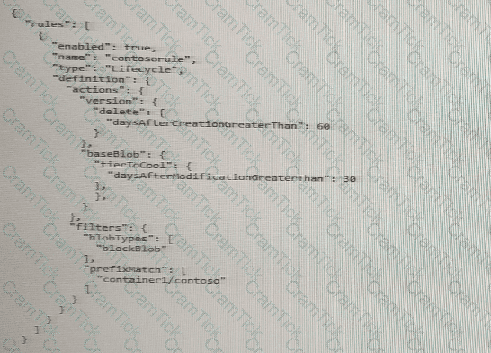 You store files in an Azure Data Lake Storage Gen2 container. The container has the storage policy shown in the following exhibit.