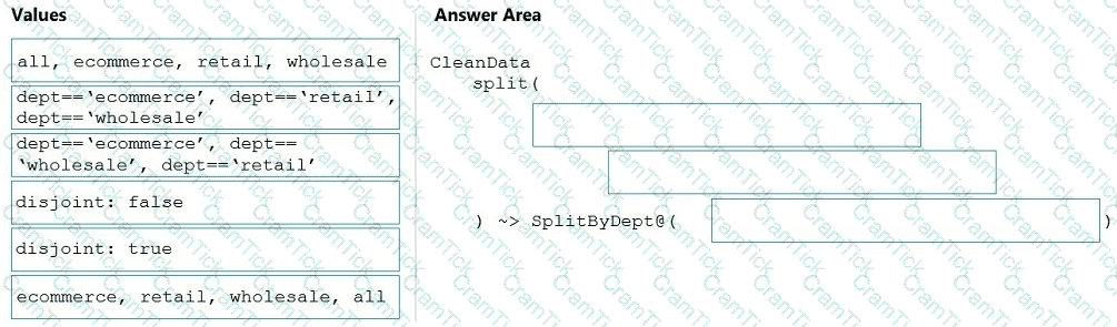How should you complete the Data Factory data flow script? To answer, drag the appropriate values to the correct targets. Each value may be used once, more than once, or not at all. You may need to drag the split bar between panes or scroll to view content.