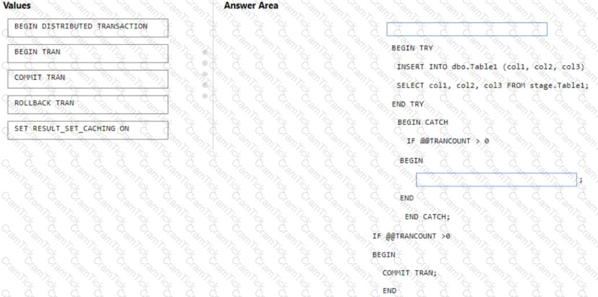 How should you complete the Transact-SQL code? To answer, drag the appropriate values to the correct targets. Each value may be used once, more than once, or not at all. You may need to drag the split bar between panes or scroll to view content.