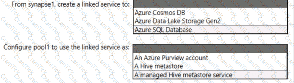You have an Azure subscription that contains an Azure Databricks workspace named databricks1 and an Azure Synapse Analytics workspace named synapse1. The synapse1 workspace contains an Apache Spark pool named pool1.