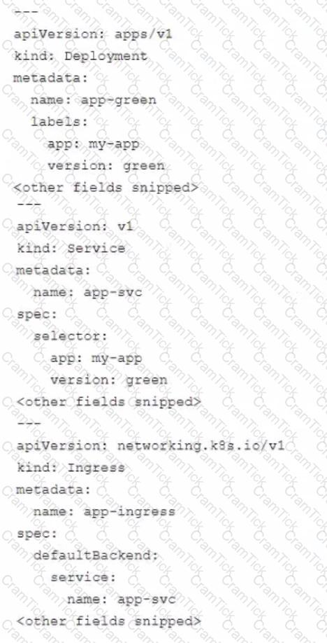 You manage an application that runs in Google Kubernetes Engine (GKE) and uses the blue/green deployment methodology Extracts of the Kubernetes manifests are shown below: