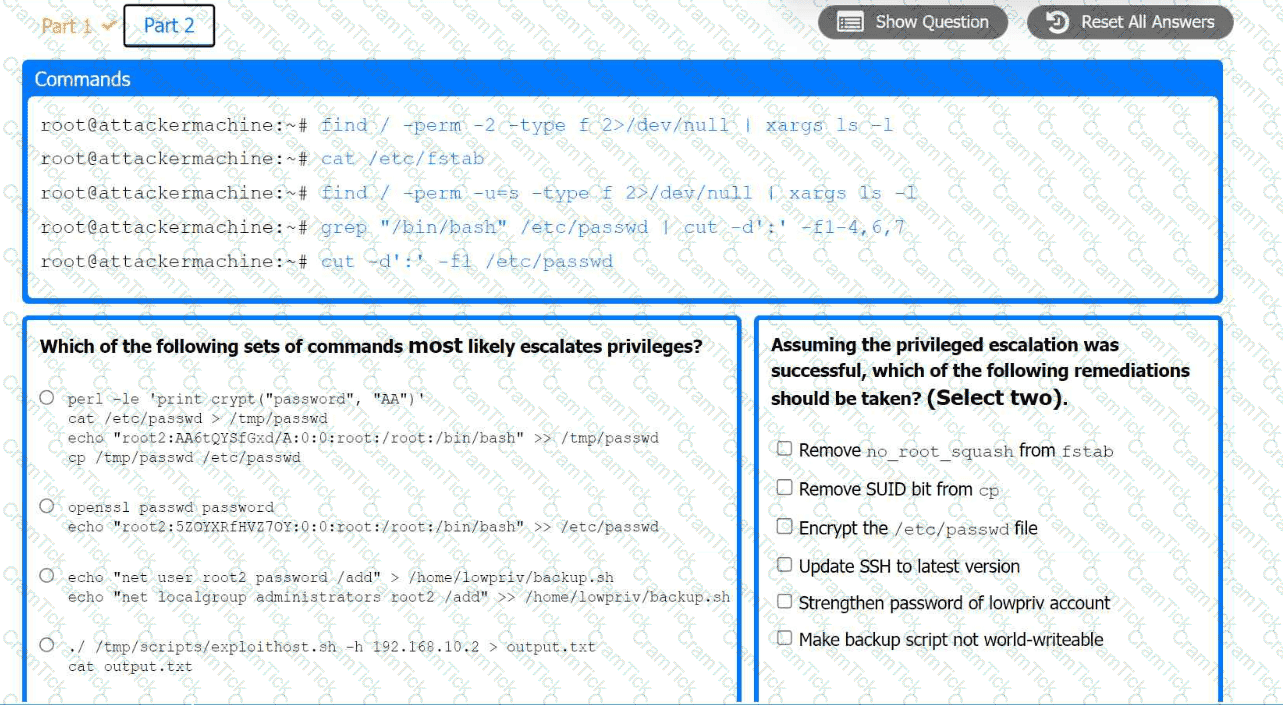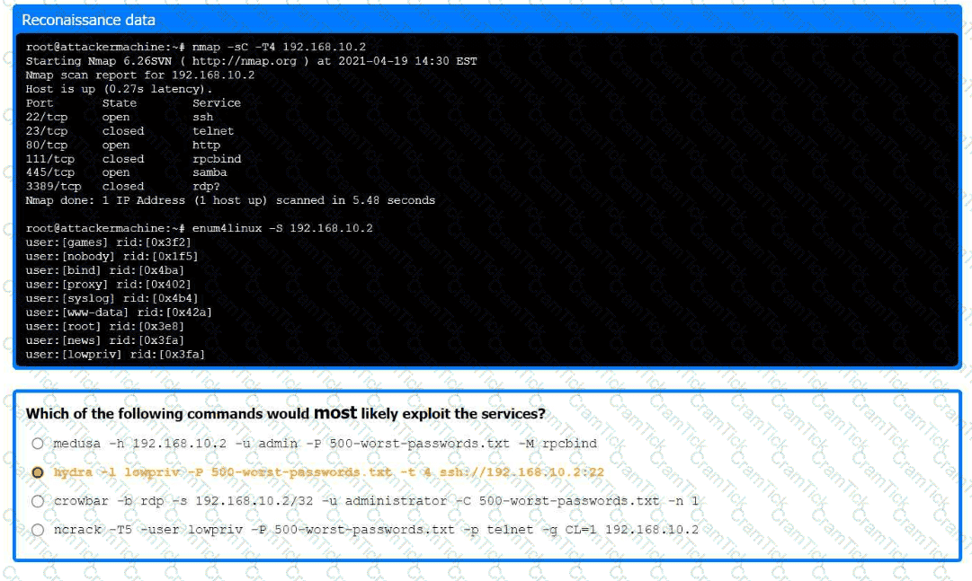 During an assessment, a penetration tester gains access to one of the internal hosts. Given the following command: