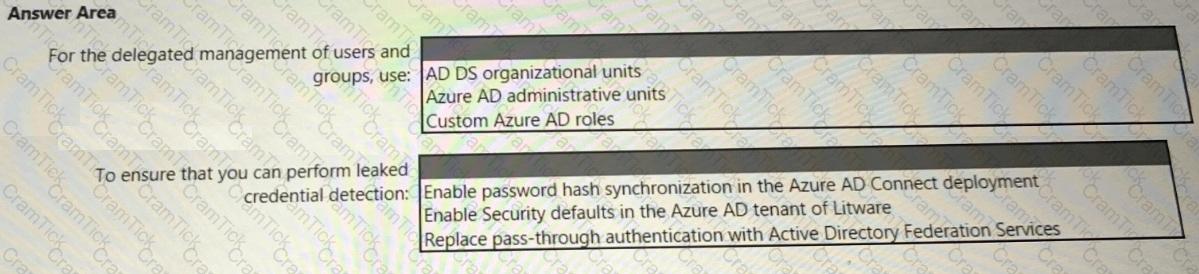 You need to recommend a strategy for securing the litware.com forest. The solution must meet the identity requirements. What should you include in the recommendation? To answer, select the appropriate options in the answer area. NOTE; Each correct selection is worth one point.