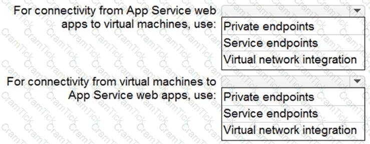 You need to recommend a strategy for App Service web app connectivity. The solution must meet the landing zone requirements. What should you recommend? To answer, select the appropriate options in the answer area. NOTE Each correct selection is worth one point.