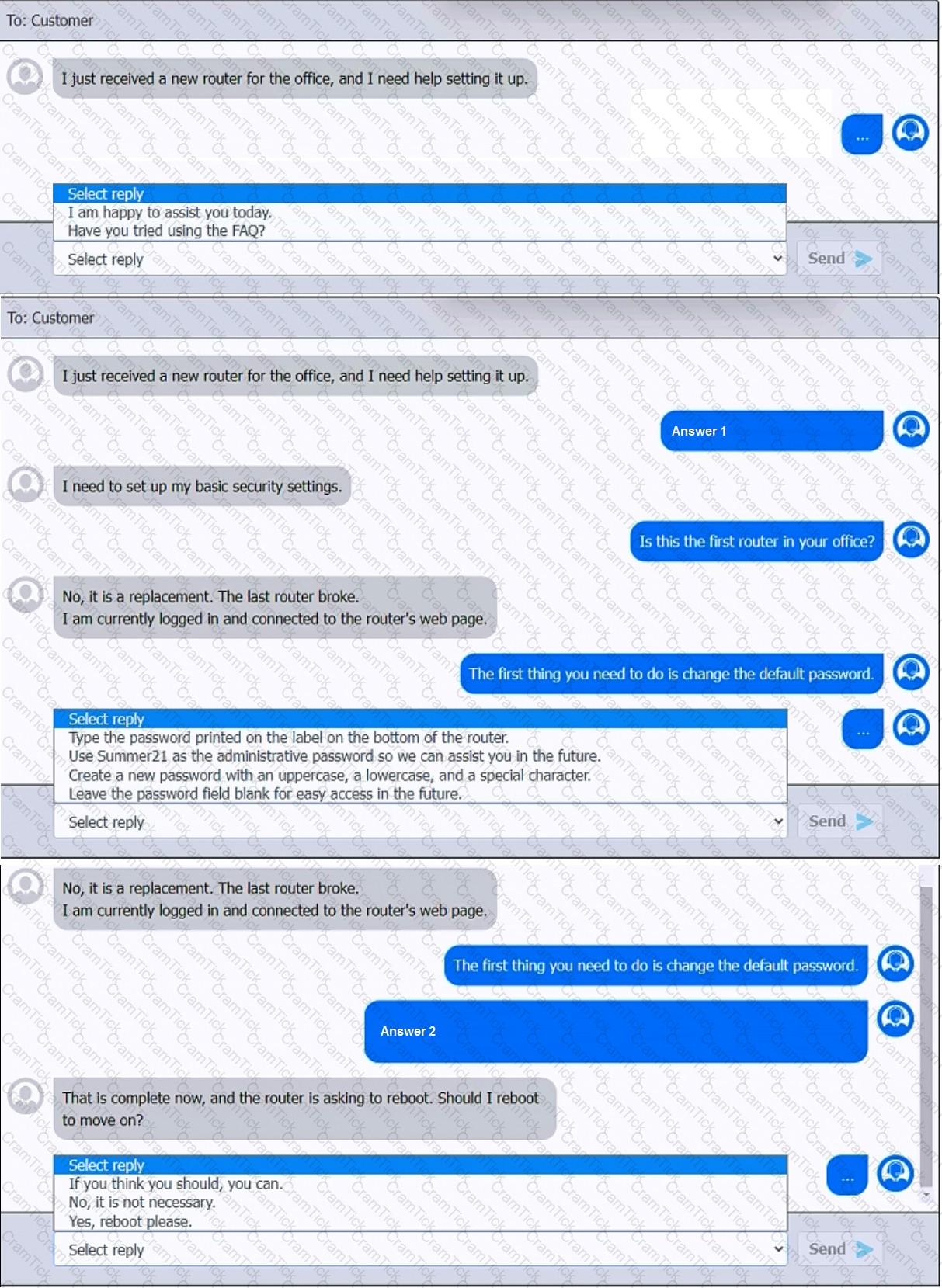 Select the most appropriate statement for each response. Click the send button after each response to continue the chat.