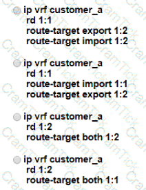The network administrator configured VRF lite for customer A. The technician at the remote site misconfigured VRF on the router. Which configuration will resolve connectivity for both sites of customer_a?