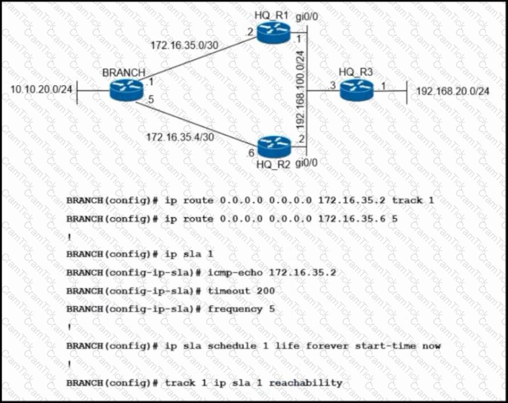 Traffic from the branch network should route through HQ R1 unless the path is unavailable. An engineer tests this functionality by shutting down interface on the BRANCH router toward HQ_R1 router but 192.168.20.0/24 is no longer reachable from the branch router. Which set of configurations resolves the issue?