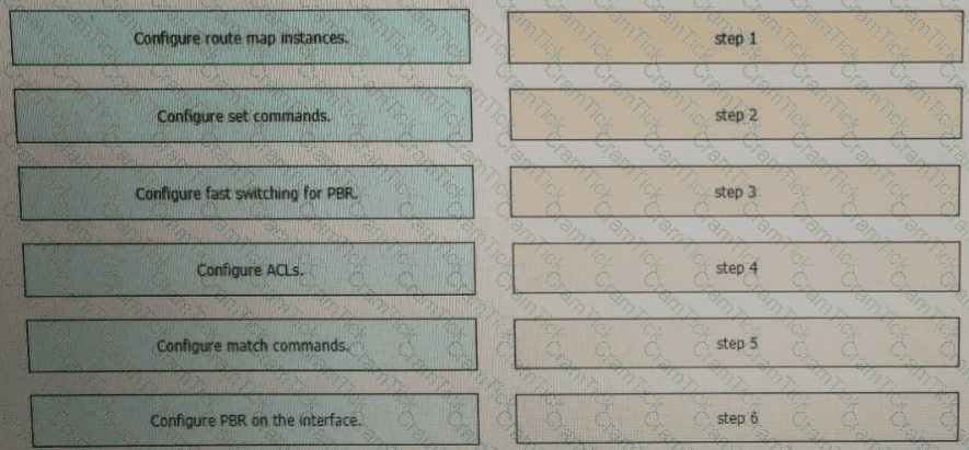 Drag and drop the actions from the left into the correct order on the right to configure a policy to avoid following packet forwarding based on the normal routing path.