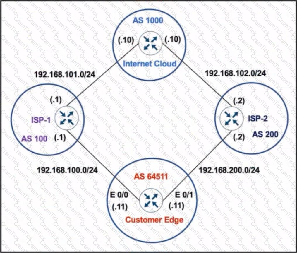 Refer to the exhibit. The network administrator has configured the Customer Edge router (AS 64511) to send only summarized routes toward ISP-1 (AS 100) and ISP-2 (AS 200).