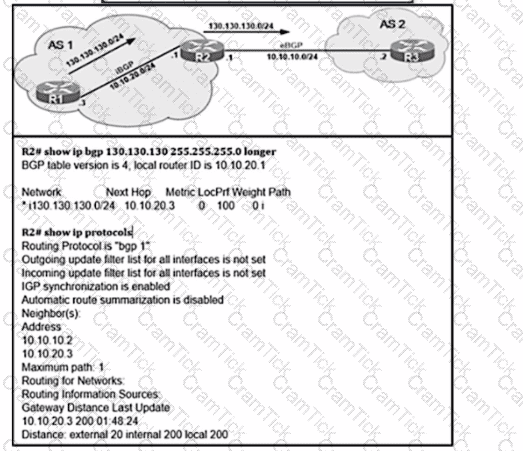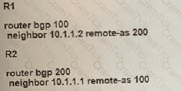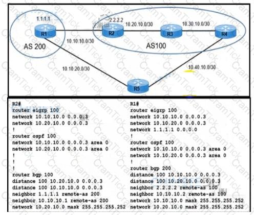 R1 and R2 use IGP protocol to route traffic between AS 100 and AS 200 despite being configured to use BGP. Which action resolves the issue and ensures the use of BGP?