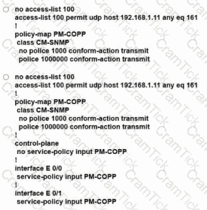 The network administrator configured CoPP so that all SNMP traffic from Cisco Prime located at 192.168.1.11 toward the router CPU is limited to 1000 kbps. Any traffic that exceeds this limit must be dropped.