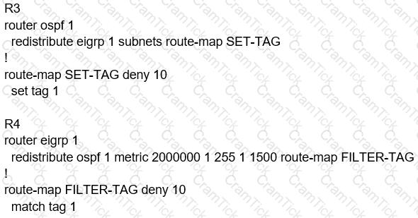 Refer to the exhibit. Which two configurations are required on R2 to prevent a routing loop caused by the redistribution from OSPF back into EIGRP? (Choose two.)