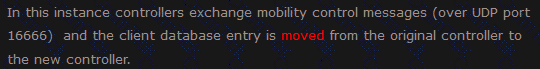 A client roams between two APs that are registered to two different controllers, where