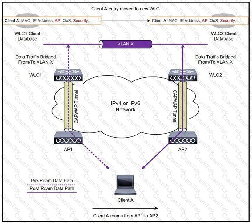 each controller has an interface in the client subnet. Both controllers are running AireOS. Which scenario explains the client roaming behavior?