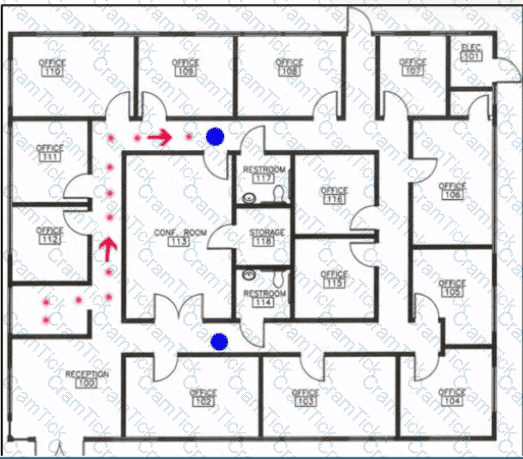 The wireless survey report shows APs staggered throughout a facility, with several of them placed on the exterior walls. Other APs are located at building corners and major turns in the structure layout. Assuming that all survey locations are optimized with a minimum of -67 RSSI at