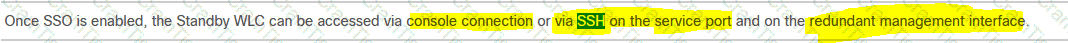 An engineer has successfully configured high availability and SSO using two Cisco 5508 Wireless LAN Controllers. The engineer can access the Active Primary WLC, but the Secondary Standby WLC is not accessible. Which two methods allow access to the standby unit? (Choose two.)