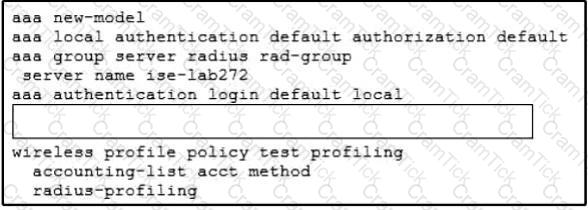 A network architect configured the Cisco Catalyst 9800 Series Controller to find out information on client types in the wireless network. RADIUS profiling is enabled so that the controller forwards the information about clients to a Cisco ISE server through vendor-specific RADIUS attributes. The ISE server is not profiling any data from the controller. Which configuration must be added in the blank in the code to accomplish the profiling on the Cisco 9800 Series controller?