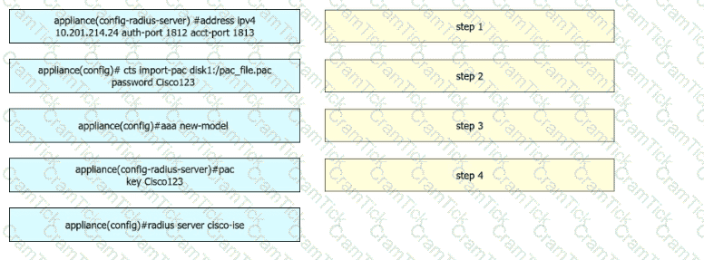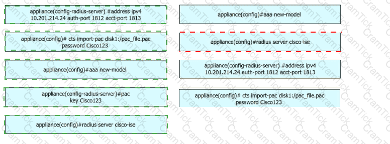 A security engineer configures a Cisco Catalyst switch to use Cisco TrustSec. The engineer must define the PAC key to authenticate the switch to Cisco IISE. Drag and drop the commands from the left into sequence on the right. Not all options are used.