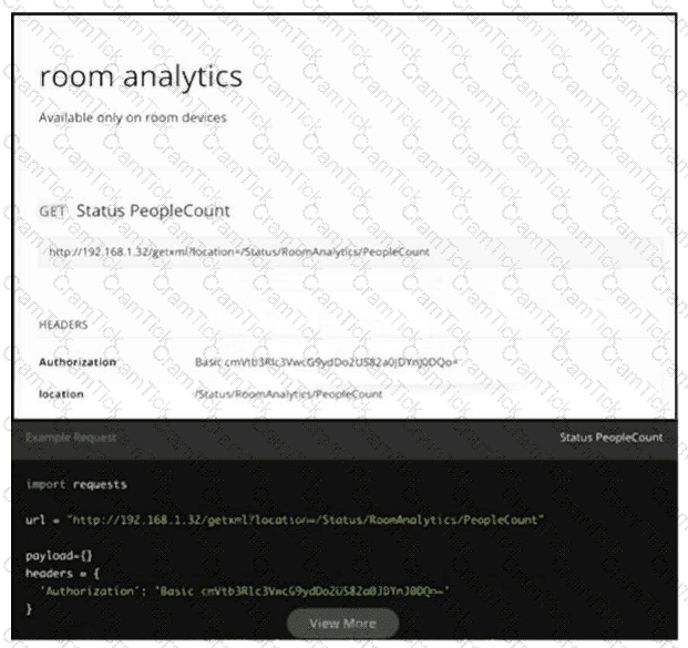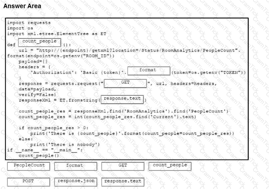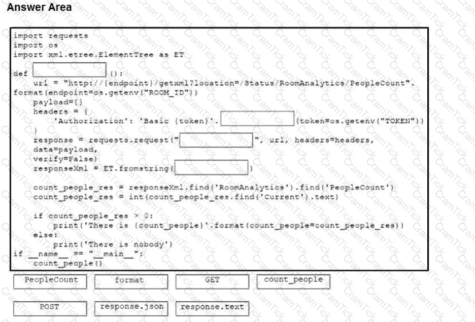 Refer to the exhibit. Drag and drop the code snippets from the bottom onto the blanks in the Python script to monitor how many people are in Room 70 by using xAPI and RoomAnalytics. Not all options are used.