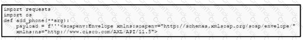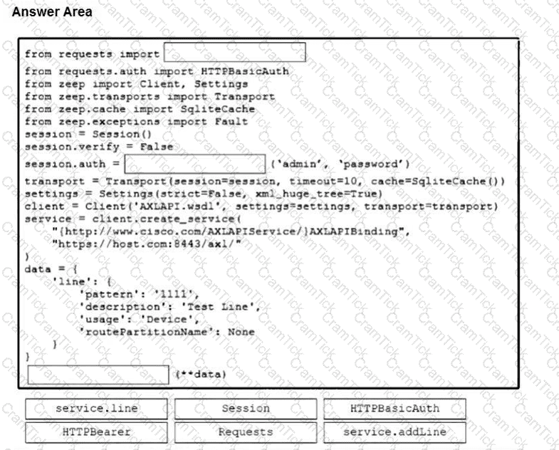 Refer to the exhibit. Drag and drop the code snippets from the bottom onto the blanks in the code to construct a Python script for Cisco UCM that