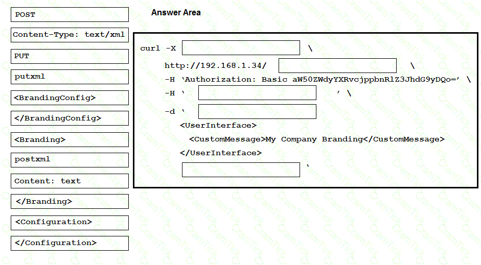 Drag and drop the commands from the left onto the curl command to create a custom branding message using the xAPI HTTP API. Not all options are used.