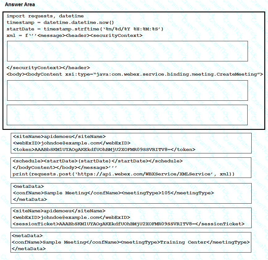 A small Python script is constructed that creates a Webex Meeting for John Doe scheduled for the current time. Drag and drop the code snippets at the bottom onto the areas of the source code exhibit to create a program. Not all options are used.