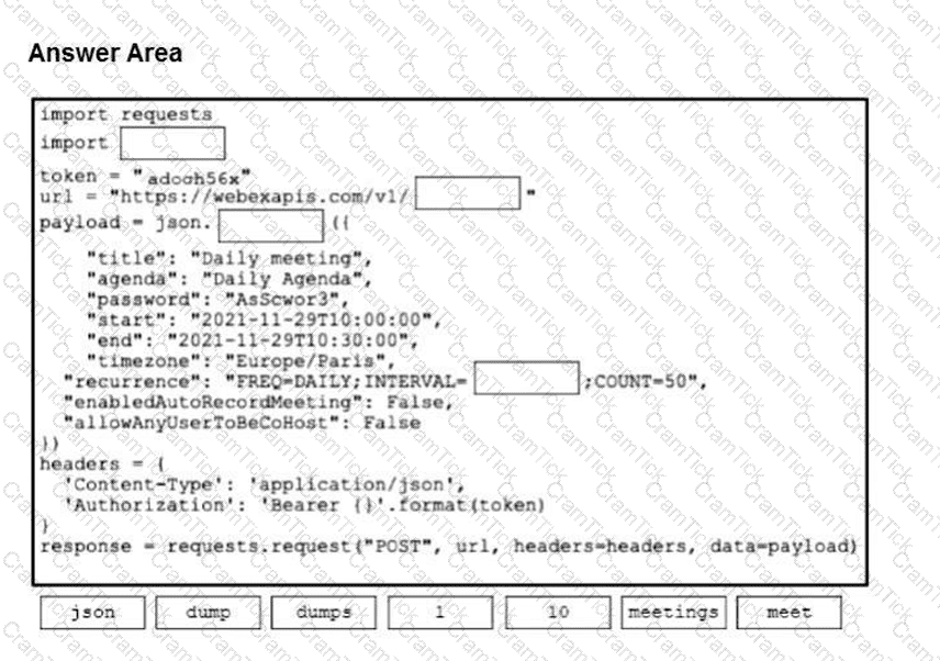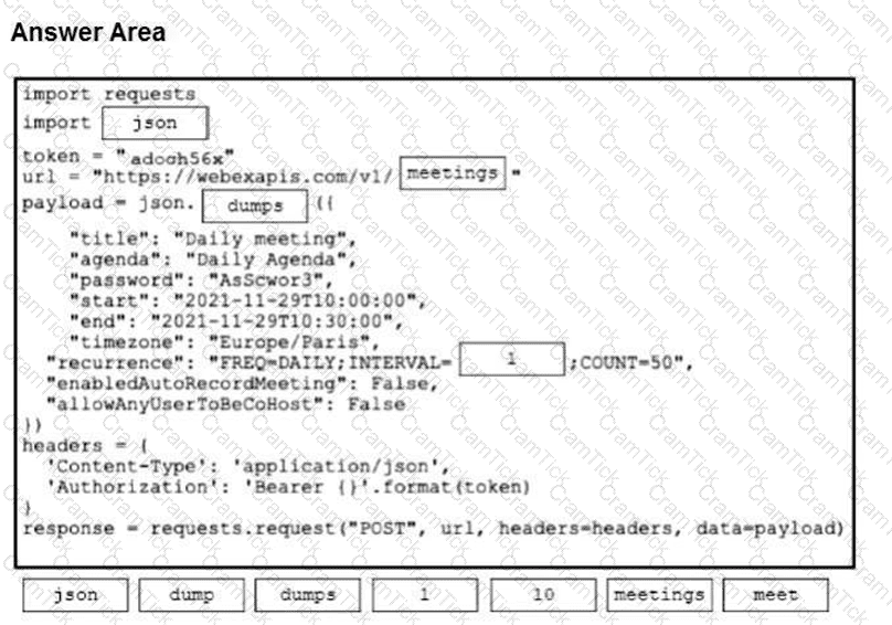 An engineer must automate the creation of daily, 30-minute meetings at 10 AM for the next 50 days. Drag and drop the code snippets from the bottom onto the boxes in the Python script to create the meetings by using the Webex Meetings API. Not all options are used.