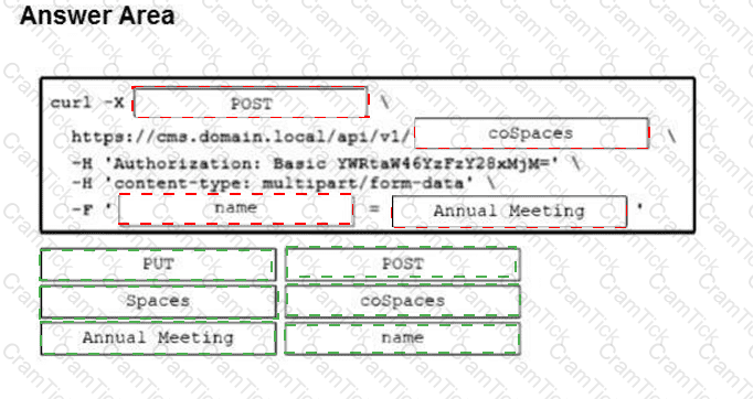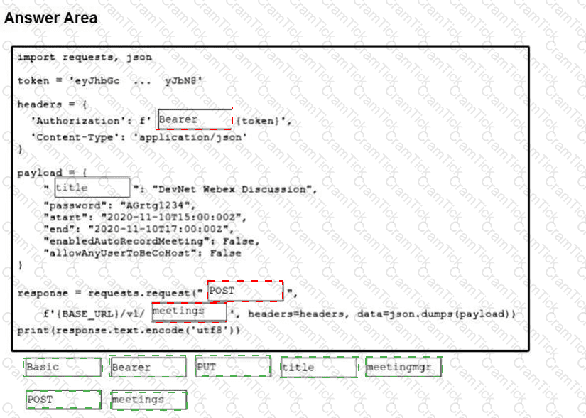 Drag and drop the code snippets from the bottom onto the blanks in the code to create a Cisco Webex Meetings meeting using the API. Not all options are used.