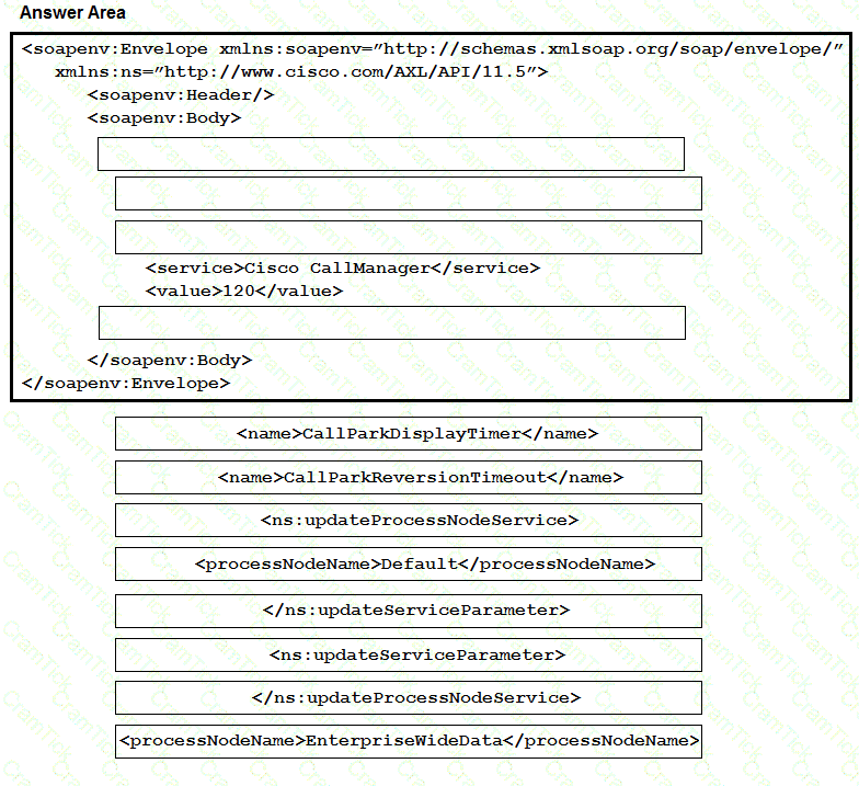 Drag and drop the XML snippets onto the AXL request to build a request that sets the cluster-wide Call Park Reversion Timer to 2 minutes. Not all options are used.