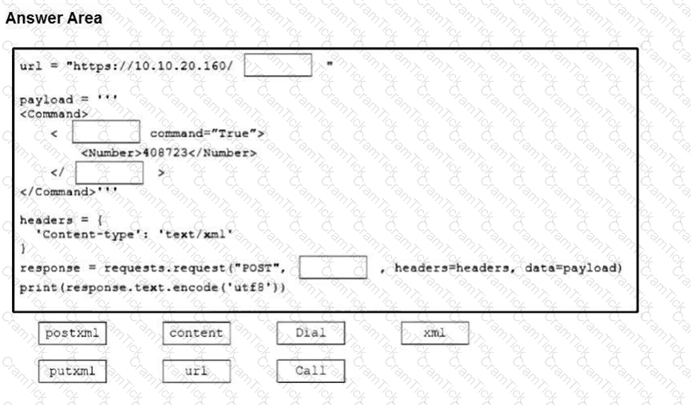 An administrator must test a Cisco collaboration room device. Drag and drop the code snippets from the bottom onto the blanks in the code to perform a test call using the xAPI. Some options may be used more than once. Not all options are used.