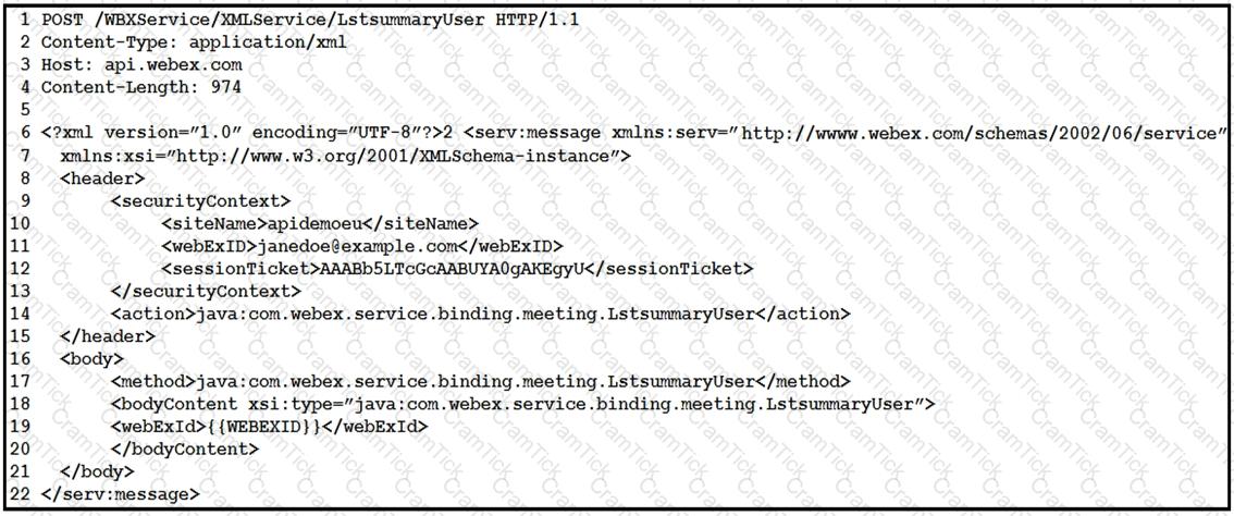 A Webex Meetings XML API HTTP request message with several invalid portions is shown. Which reference points to a line in the exhibit that correctly indicates that this is a LstsummaryUser request?