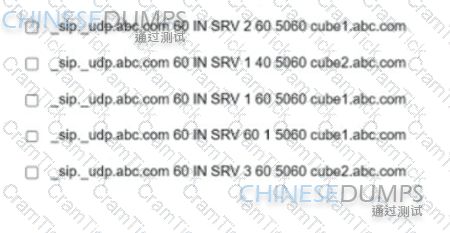A customer reports that the load balancing solution is not working (or two Cisco Unified Border Element routers. The (cube1.abc.com) router should take 60% of the calls, and the (cube2 abc.com) router should take 40% of the calls. Assuming all DNS A records are present, which two SRV configurations would provide the desired outcome? (Choose two.)