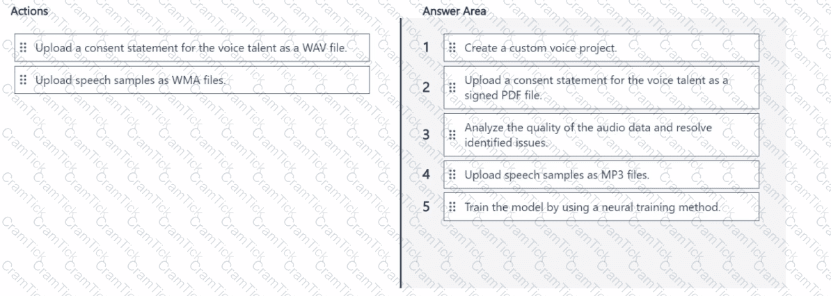 Which five actions should you perform in sequence from Speech Studio? To answer, move the appropriate actions from the list of actions to the answer area and arrange them in the correct order.