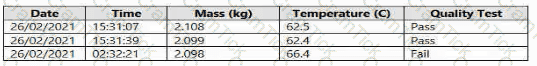 You have an Azure Machine Learning model that predicts product quality. The model has a training dataset that contains 50,000 records. A sample of the data is shown in the following table.