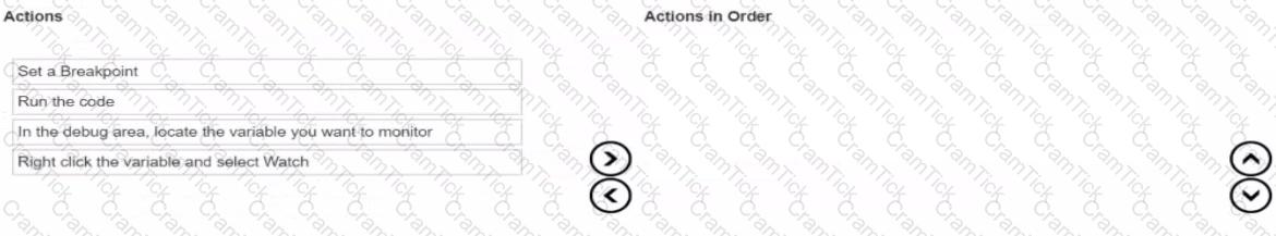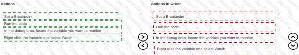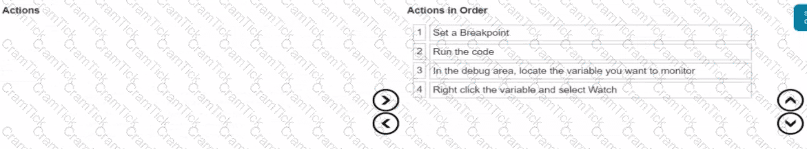 You need to create a Watchpoint in Xcode. In which order should you complete the actions? Move all the actions to the answer area and place them in the correct order.