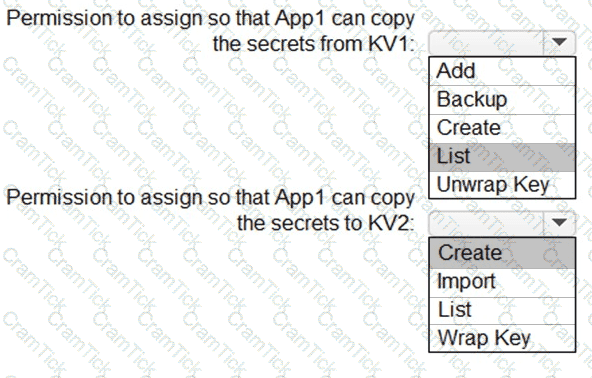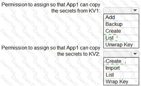 You need to configure permissions so that App1 can copy all the secrets from KV1 to KV2. App1 currently has the Get permission for the secrets in KV1.