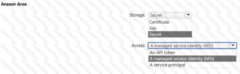 What should you recommend using to store and access the key? To answer, select the appropriate options in the answer area.