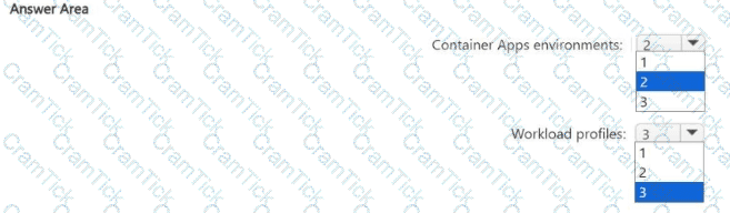 You need to recommend the minimum number of Container Apps environments and workload profiles required. What should you recommend? To answer, select the appropriate options in the answer area.