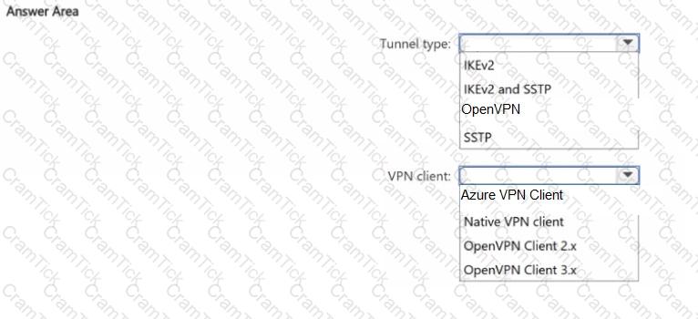 Which type of tunnel should you configure, and which VPN client should you configure on the users' devices? To answer, select the appropriate options in the answer area.