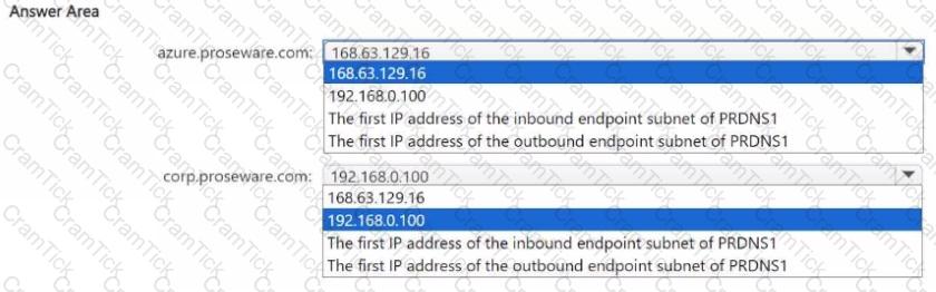 You need to configure the destination IP address for azure.proseware.com and for corp.proseware.com. The solution must meet the general requirements.