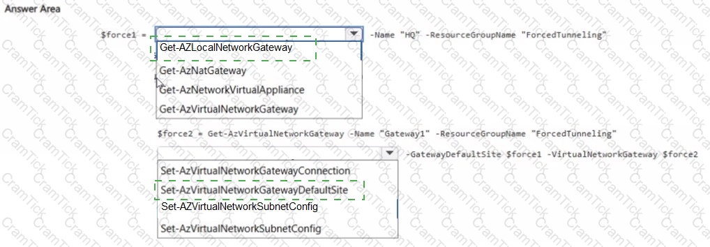 How should you complete the PowerShell script to configure forced tunneling? To answer, select the appropriate options in the answer area.