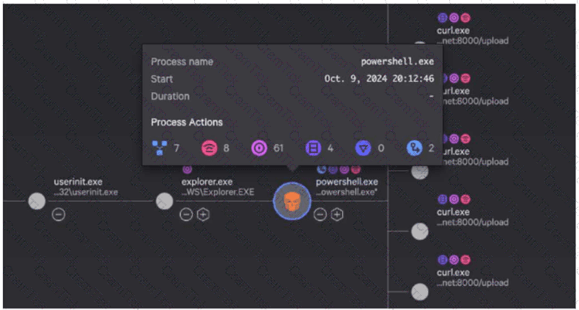 While investigating a process tree, you hover over a malicious powershell.exe process. What is the correct sequence of Process Actions?