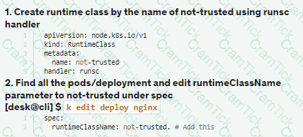Create a RuntimeClass named not-trusted using the prepared runtime handler names runsc.