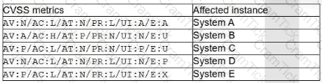 A company has decided to expose several systems to the internet, The systems are currently available internally only. A security analyst is using a subset of CVSS3.1 exploitability metrics to prioritize the vulnerabilities that would be the most exploitable when the systems are exposed to the internet. The systems and the vulnerabilities are shown below: