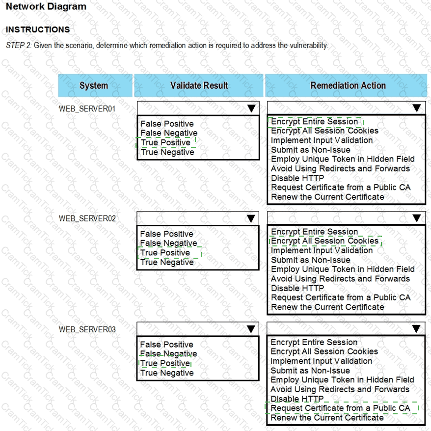 After reviewing the information provided in the network diagram, select the STEP 2 tab to complete the simulation by selecting the correct Validation Result and Remediation Action for each server listed using the drop-down options.