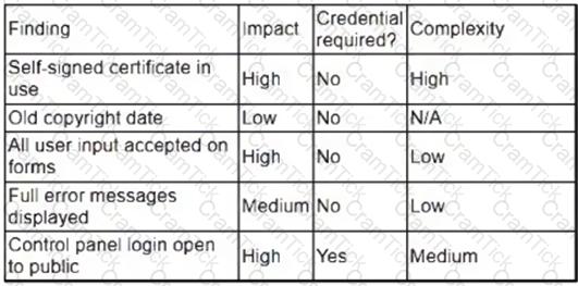 A security analyst obtained the following table of results from a recent vulnerability assessment that was conducted against a single web server in the environment: