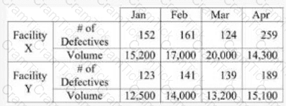 This question refers to the following situation. A company has two facilities that ship the same product. The following table shows the number of defectives and the total volume for the facilities, per month. There is one opportunity per unit.